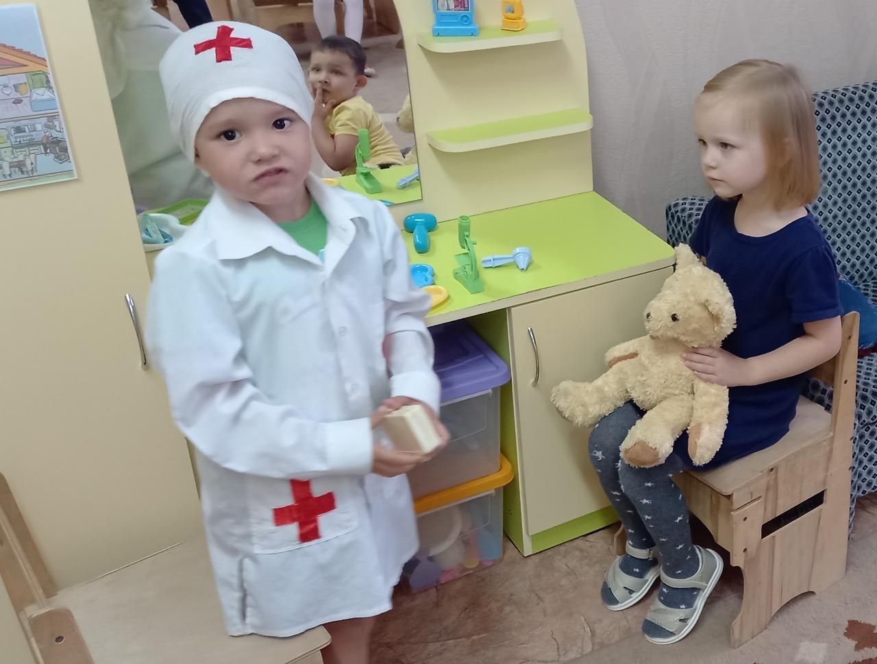 Сонымен, тәрбиеші Алеся Николаевнаның басшылығымен «Пчелки» кезекші орта тобының балалары «Ветеринарлық клиника» сюжеттік-рөлдік ойынын ойнайды. Бұл іс-әрекет барысында қарым-қатынас мәдениетін тәрбиелеу және балалардың сөздік қорын байыту, сонымен қатар диалогтік сөйлеуді дамыту және рөлдік ойындарда өз рөлін орындау қабілетін қалыптастыру жүзеге асырылады. Тәрбиеші К.Чуковскийдің «Доктор Айболит» ертегісін алдын-ала оқыды. Мәтін бойынша балалармен сөйлесті. Ол қаладағы жануарларды жануарларға арналған арнайы ауруханаларда емдейтінін айтты. Дәрігерлер ветеринар деп аталады, ал аурухана - ветеринарлық. Бұл проблемалық жағдай туғызды – топқа іштің ауыруы туралы шағымы бар аю келді, тәтті жақсы көреді балды көп жейді деп болжады тәрбиеші. Ол кедей жігітке ветеринардың рөлін алып, оны емдеуге көмектесуді ұсынды. Жағдайды ойнап болған соң тәрбиеші балалармен рөлдерді өзгертеді, дәрігер мен шеберді таңдайды және екінші рольді алады. Осылайша балалар мал дәрігері мамандығымен танысты.