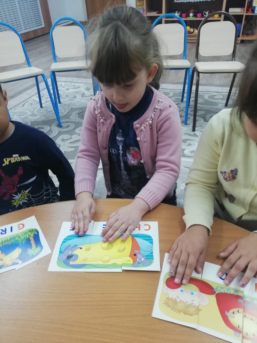 Мектепалды даярлық тобының кезекші тобымен ағылшын тілін оқыту бойынша сабақтарда ағылшын тілі мұғалімі Алена Александровна «Magiccards» белсенді қолданады, бұл шыдамдылықты, дәлдікті, шыдамдылық пен мұқияттылықты талап ететін қызықты дамытушы және үйретуші ойын, ол сөз атауымен сүйемелденетін пазл түріндегі жарқын суреттер жиынтығынан тұрады. Әр сурет үш бөліктен тұрады, әр бөліктің төменгі жағында әріп немесе әріп бар. Суретті жинау кезінде бала бөлік пен тұтас арасындағы байланысты үйренеді, логикалық ойлау мен қолдың ұсақ моторикасын дамытады. Карточкалармен жұмыс істеудің маңызды аспектісі жүйелі, алдын-ала және кейінгі жұмыс болып табылады.