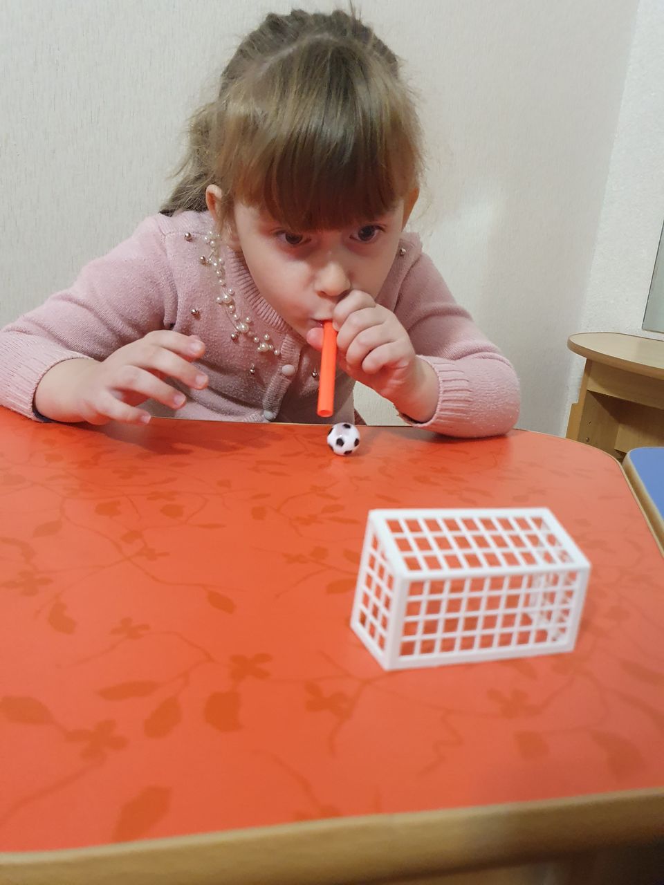 На фото ребенок выполняет дыхательную гимнастику «Загони мяч в ворота».
