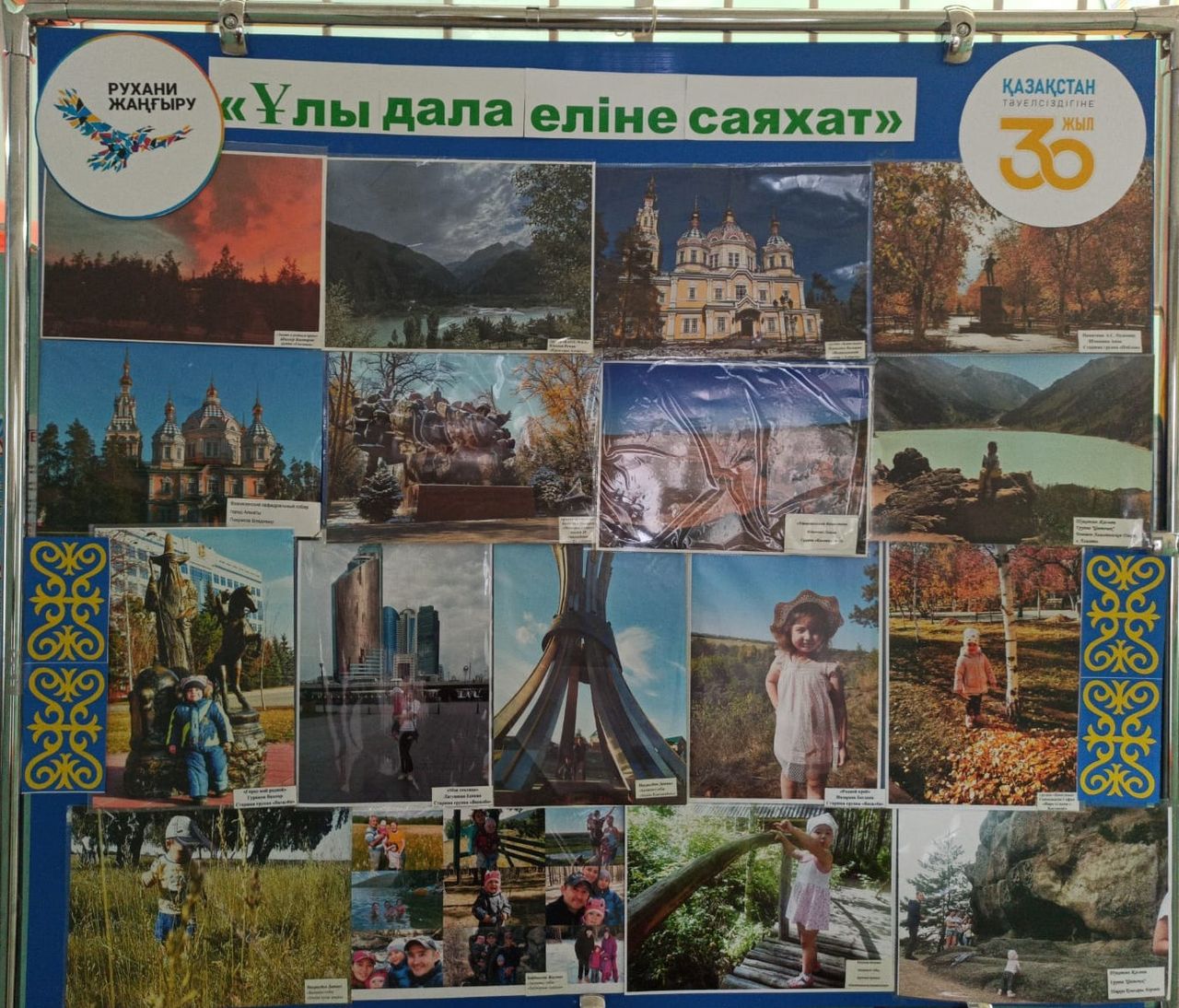 С целью привлечения внимания воспитанников к истории, культуре, достопримечательностям, природе Республики Казахстан, в рамках программы «Рухани жаңғыру», в преддверии 30 - летия Независимости РК, родителям детей было предложено принять участие в фотовыставке «Ұлы дала еліне саяхат». Необходимо было принести фотографию ребенка возле любого памятного места нашей страны, города или фотографию красивого пейзажа, таким образом, выразить языком фотоискусства любовь к родному краю, к стране.